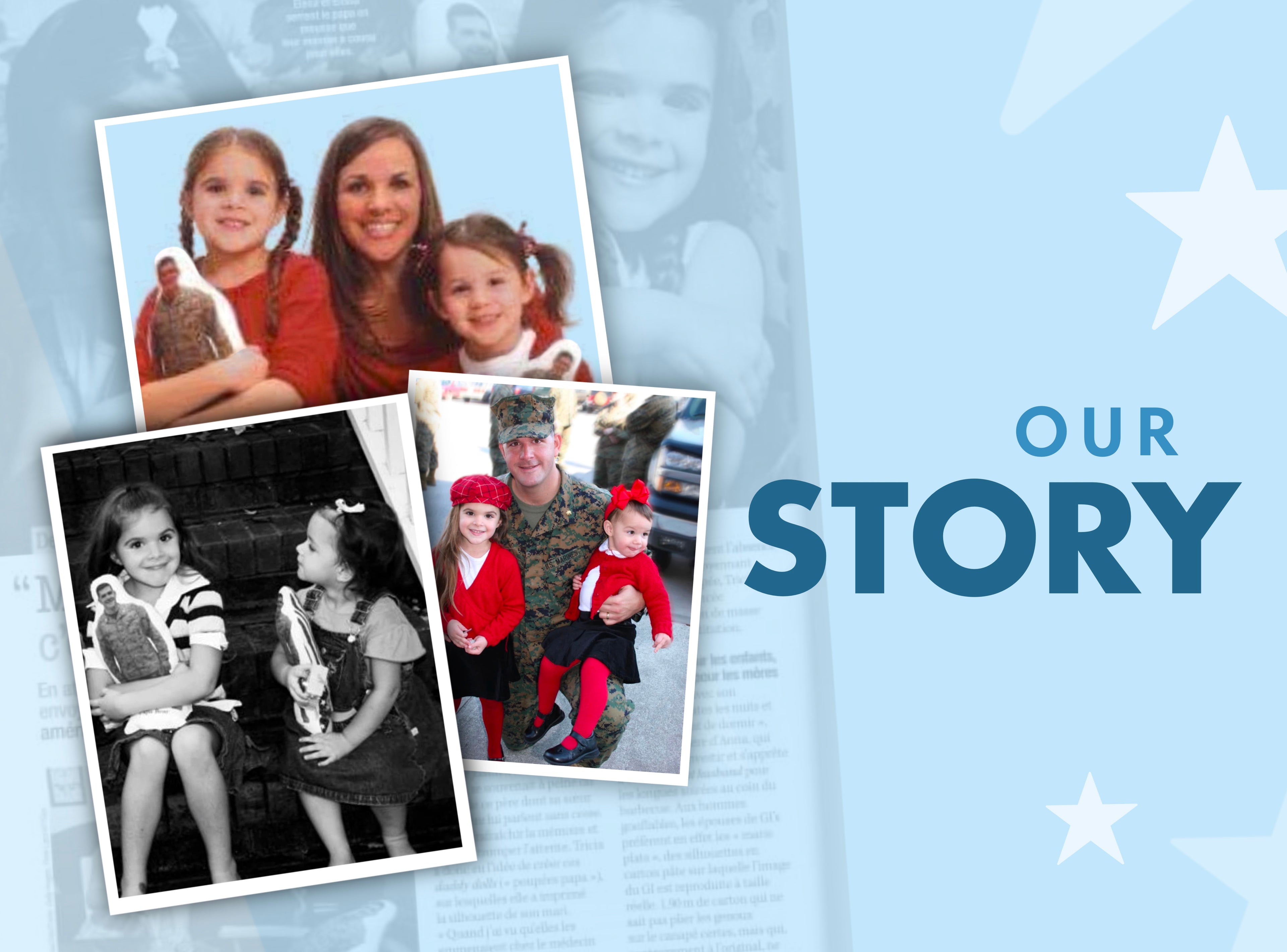 Our founder, Tricia Dyal, started Hug-A-Hero® (originally Daddy Dolls) after witnessing first hand how hard military deployments were on her children. After multiple deployments, the absence of daddy was beginning to take its toll. She wanted to find some way to make the separation easier for her daughters while keeping their father close to their hearts and in their prayers. With her determination to bridge the gap and Aunt Mary's creativity, Hug-A-Hero was born!